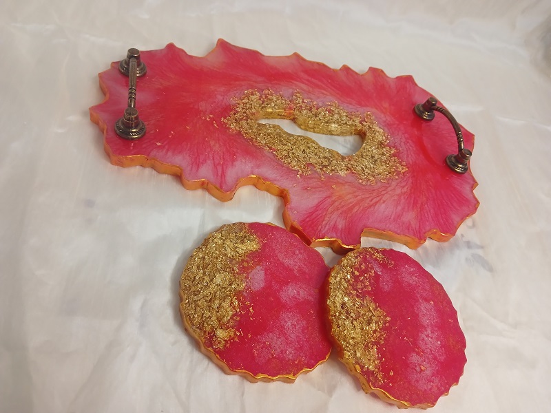 Epoksi Geode Kırmızı Altın Varaklı Tepsi Ve Bardak Altlığı Seti, epoksi reçineden üretilmiştir. Ölçüsü 34*21 cm, Bardak altlığı 10 cm'dir. Yüzeyi cam gibi parlak, yapısı mermer gibi serttir. Kırmızı ve altın varaklı geode şekilli el yapımı sunum tepsisini, ister söz, nişan isterseniz de günlük sunumlarınızda kullanabilirsiniz. Ürün bir adet tepsi, iki adet bardak altlığı gönderilecektir.